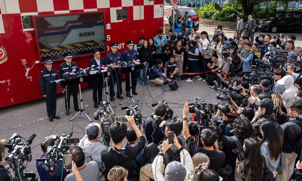 At a press conference jointly held by the Hong Kong Safety Bureau, Fire Department and Hong Kong Police Force on Friday afternoon for an update on the devastating five-alarm fire that broke out at Wang Fu Court in the Tai Po Housing Estate, Chief Security Officer Chris Tan said a preliminary investigation revealed that the external scaffolding netting and protective netting of the building involved in the fire met fire-resistance requirements, but the foam panels installed on the external windows were highly flammable, Global Times reported.